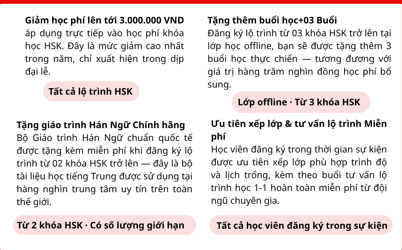 Giảm đến 3.000.000 VND học phí · Tặng 3 buổi học offline · Tặng giáo trình Hán Ngữ chính hãng. Chương trình chỉ áp dụng trong thời gian có hạn — đừng để sự do dự khiến bạn mất đi cơ hội đầu tư tốt nhất trong năm.